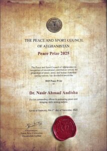 The Peace and Sport Council of Afghanistan extends its heartfelt congratulations to Ambassador Dr. Nasir Ahmad Andisha for receiving the 2025 Peace Prize. His unwavering commitment to peacebuilding, humanitarian advocacy, and principled diplomacy continues to inspire Afghanistan’s at home and around the world.