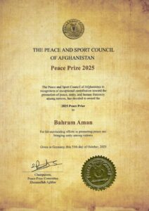 Peace and Sport Council of Afghanistan Awards 2025 Peace Prize to Bahram Aman