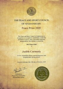 The Peace and Sport Council of Afghanistan has proudly awarded the 2025 Peace Prize to Ms. Judith Carmody in recognition of her outstanding contribution to peacebuilding, psychological wellbeing, and the promotion of safe, inclusive environments through leadership and advocacy.