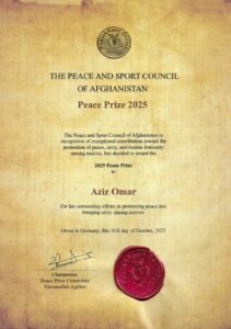 The Peace and Sport Council of Afghanistan has announced Mr. Aziz Omar as the recipient of the 2025 Afghanistan Peace Prize, recognizing his decades-long commitment to diplomacy, reconciliation, and global peacebuilding.