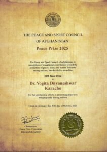 The Peace and Sport Council of Afghanistan is honored to announce that Dr. Yogita JD Karache, President of the World Chapter and a distinguished Socio-Political Analyst, has been awarded the 2025 Peace Prize. This prestigious recognition celebrates her exceptional contributions to international peacebuilding, social welfare, and her dedication to promoting preventive strategies that strengthen global security and human resilience.