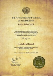 Peace and Sport Council of Afghanistan Awards the 2025 Peace Prize to Mr. Abdullah Rasouli