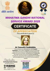 The Peace & Sports Council of Afghanistan (PSCA) proudly announces that Dr. Tanzaire Vashishtha has been awarded the ‘Mahatma Gandhi National Service Award 2025’ on 27th November 2025 in New Delhi.